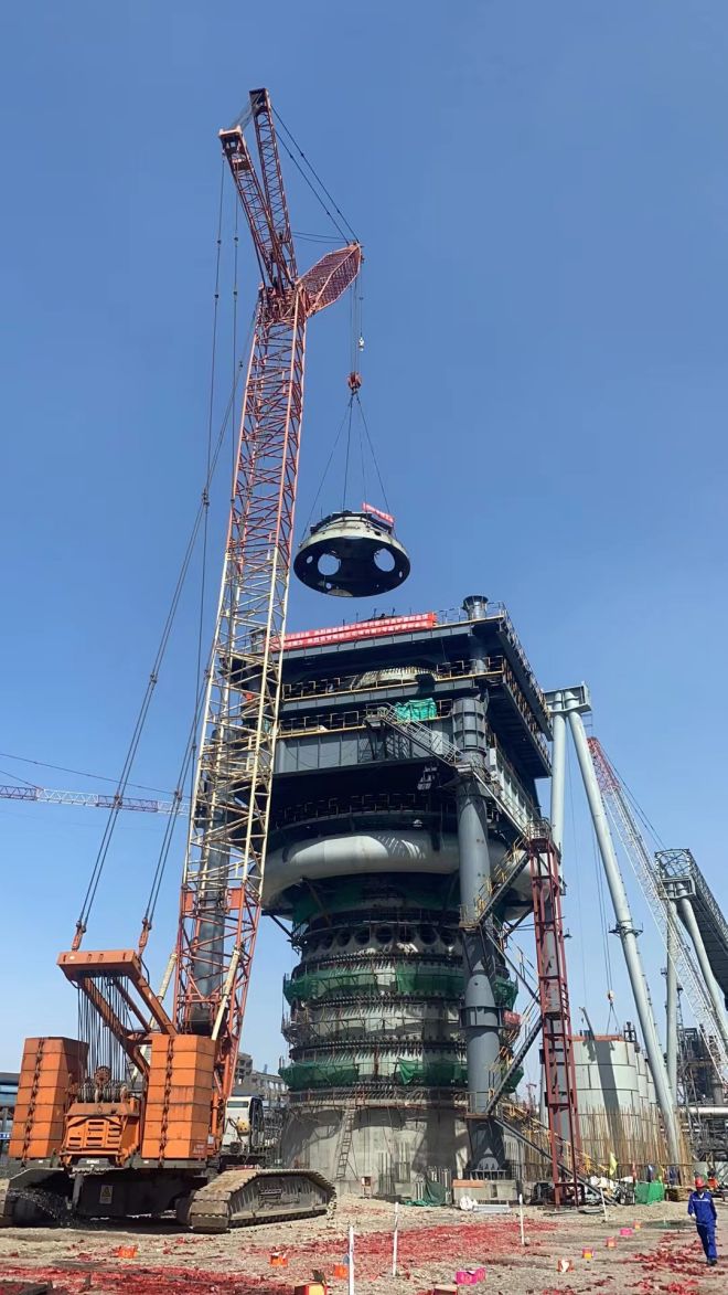 自2023年4月1日高爐爐殼首吊以來,項目部克服了氣候惡劣、構(gòu)件材料供應短缺等不利影響,通過精心謀劃、合理組織,于6月18日較原計劃提前12天完成了高爐爐殼封頂?shù)年P鍵節(jié)點。本次高爐爐殼最后一段吊裝是將第十八、十九、二十帶爐殼組焊后,再進行吊裝,下口直徑為9.02米,上口直徑為3.24米,高3.8米,重量達48噸,選用400噸履帶吊完成吊裝作業(yè)。隨著項目負責人一聲令下,最后三帶爐殼順利起鉤,隨后精準安裝到位,高爐爐殼順利封頂。