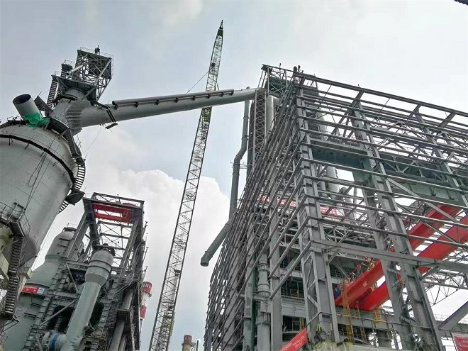 該項目位于印度尼西亞中蘇拉威西省莫羅瓦利縣青山工業園區內,主要工程內容為新建一座1780立方米高爐及其配套系統。此次吊裝的高爐下降管直徑為3米、長51米,連帶煤氣回收主管、均壓煤氣管總計80噸。下降管的吊裝是整個高爐工程施工中一個關鍵性的節點,由于下降管與下降管彎頭和重力除塵器斜三通之間有兩個空中對接口,因此對吊裝要求很高。為順利完成此次吊裝任務,項目團隊針對場地狹小、吊裝角度小、吊裝難度大等實際困難,精心策劃吊裝方案,精確計算吊裝凈空、吊車能力及設備強度與穩定性,確保了一次平穩吊裝到位。