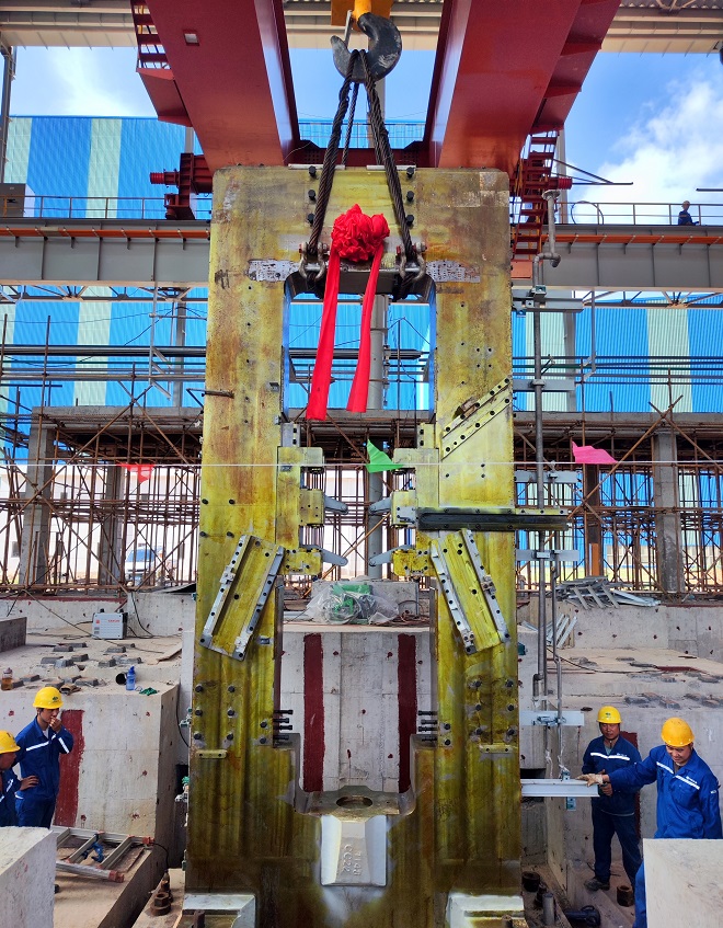 本次吊裝的平整機牌坊單片重量達42噸,長2.63米,寬0.5米,高6.56米。為確保吊裝順利進行,項目部提前策劃、精心組織,迅速完成了平整機底座墊板組加工、土建基礎復測、預制座漿墩制作、底座調整及驗收等工作,為7月25日的平整機牌坊首吊奠定了堅實基礎。吊裝當天,項目部采用45噸橋式起重機進行作業,牌坊設備在起重機的牽引下圓滿吊裝就位。