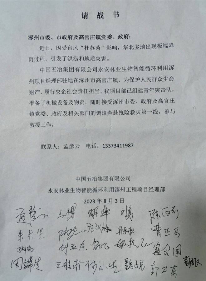 在防汛形勢嚴峻的涿州市,五冶永安林業項目部充分調動自身資源,籌集礦泉水、方便面、面包、餅干等生活物資共計120箱,捐贈到涿州高官莊鎮政府,為周邊鄉鎮受災百姓送上溫暖。為切實保護人民群眾生命財產,項目團隊迅速組建了青年突擊隊,備好各類機械物資,集合作業人員共同簽署了“請戰書”遞交屬地黨委、政府,時刻準備奔赴搶險救災第一線。