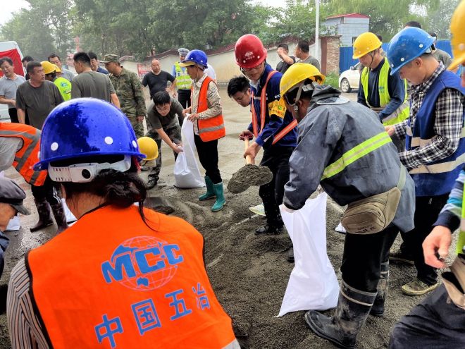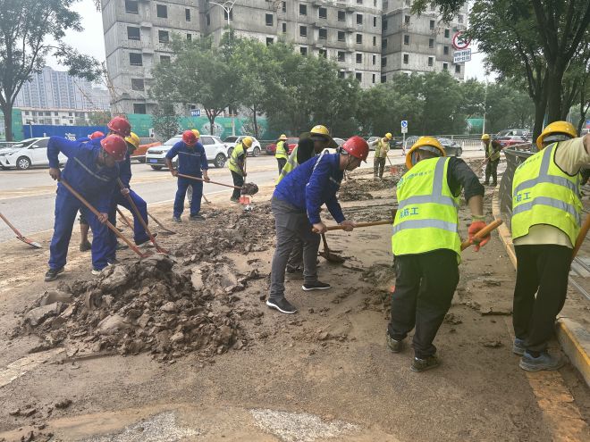 位于北京暴雨重災區門頭溝的中國五冶項目團隊在得知永定河河水超過警戒線、越過河道進入居民小區這一消息后,項目部立即出動挖掘機、籌措沙袋、組織人員全速協助永定鎮政府進行封堵、清淤等工作。針對永定鎮市政道路因極端天氣導致雨水、淤泥堆積影響市民正常出行這一情況,項目團隊快速組織鏟車、挖掘機和50余名作業人員參與道路清理,全力保障周邊居民正常出行。