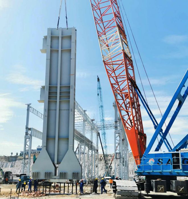 由于項目地處海外,建設團隊在材料供應、人員派遣、大型機械租賃等諸多環節遭遇了重重困難。為確保鋼結構吊裝安全、高效、順利完成,項目部周密策劃、搶先布局,通過精心組織,順利完成了首批鋼結構的運輸工作、大型機械及輔材供應等資源整合工作,為鋼結構首吊創造了有利條件。本次首吊的鋼柱長22米,重99噸,在現場負責人的指令下,掛鉤、起吊、落位一氣呵成,第一根鋼結構被精準安裝到位,正式拉開了該項目高跨鋼結構安裝的序幕。