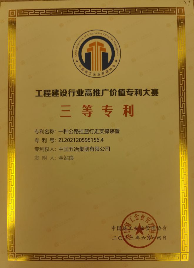 “一種公路掛籃行走支撐裝置”榮獲“工程建設行業高推廣價值專利大賽”三等專利。本發明專利公開了一種公路掛籃行走支撐裝置的使用方法的研究應用,其創新點在于提供了一種無需拆裝千斤頂的公路掛籃行走支撐裝置。本專利改變原有的施工思維方式和技術效果,降低了勞動強度和作業時長,消除了安全隱患。從公路掛籃操作過程中,制定了一種公路掛籃行走支撐裝置的研制說明書和操作方法,在公司相關產品或技術布局的系列專利申請中具有小、新、實用性強等鮮明特點,應用范圍較為廣泛,具有較高的推廣運用價值。