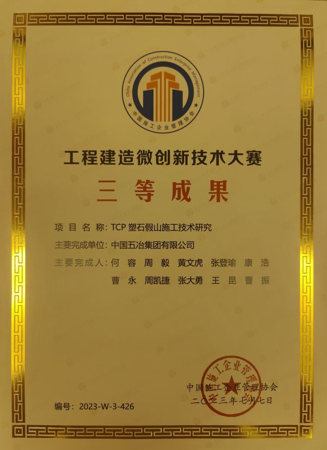 “TCP 塑石假山施工技術研究”榮獲“工程建造微創新技術大賽”三等成果。中國五冶集團華東公司承建的2021年揚州世界園藝博覽會世博園項目核心景觀“夢幻疊瀑”設計了仿真實石型結構造型,為營造出流水瀑布的真實感,大體積假山結構部分采用了TCP材料建造,并對該結構開展了設計、加工、施工的技術攻關研究,形成了多項自主創新技術。