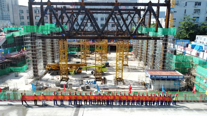 2023年9月23日,隨著最后一根鋼結(jié)構(gòu)桁架穩(wěn)穩(wěn)升空吊裝到位,由中國五冶集團(tuán)有限公司承接的深圳市光明區(qū)玉塘文體中心新建項(xiàng)目體育館桁架區(qū)及以下鋼結(jié)構(gòu)全面封頂,標(biāo)志著本項(xiàng)目取得階段性進(jìn)展,進(jìn)入主體結(jié)構(gòu)封頂?shù)臎_刺階段。
