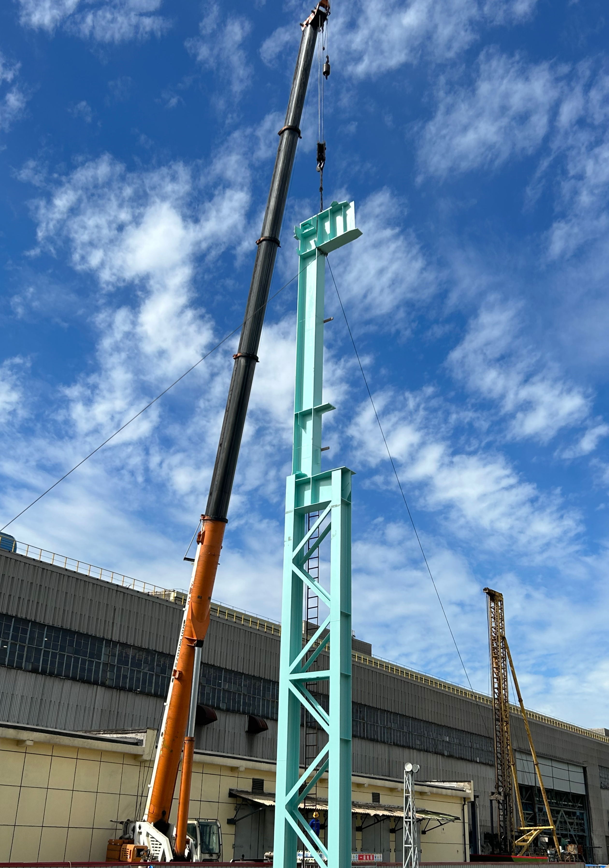 寶鋼冷軋廠C411機組項目是在原有生產廠房基礎上進行施工,建設空間和場地制約條件多,作業難度大,工程進度緊。為確保鋼結構吊裝安全、高效、順利完成,項目部多次組織例會進行專項研討,將每一個步驟都落實到細節,并對作業班組進行了詳細的技術質量及安全交底。本次首吊的鋼柱長25.3米,重12.97噸。在現場負責人的指令下,作業人員按照要求檢查吊具、掛鉤、起吊、落位一氣呵成,第一根鋼結構精準安裝到位,正式拉開了項目鋼結構主體安裝的序幕。