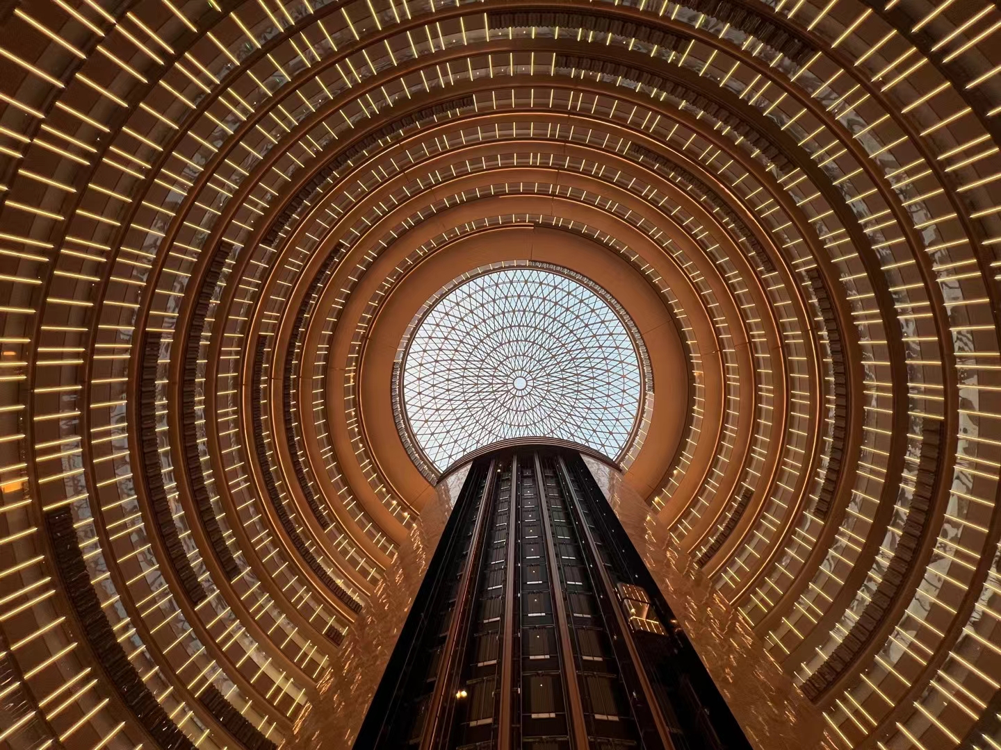 太陽酒店形態(tài)為一座19層球體建筑,建筑標(biāo)高97.8米,球體直徑98米。酒店中庭為中空結(jié)構(gòu),沒有一根梁柱支撐,全靠外圍鋼結(jié)構(gòu)層層拼搭而成。要保證整體結(jié)構(gòu)安全,每一層的圓心必須要在一條垂直線上,安裝精度控制成為了建設(shè)過程中的空前難題。