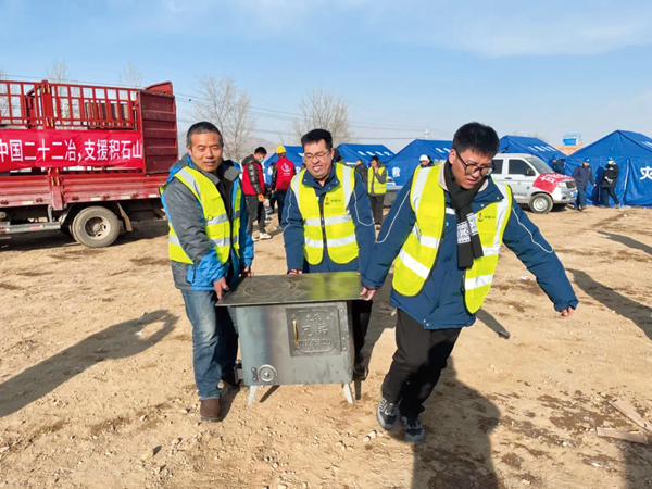 中國二十二冶西北公司蘭州瑞南紫郡項目部積極與甘肅積石山縣災區取得聯系,連夜籌集30頂加厚保溫帳篷、50個火爐、300套被褥三件套等災區急需防寒物資,第一時間運往200多公里外的積石山災區,歷經7個小時,于2023年12月23日下午送達積石山縣吹麻灘鎮,并立即組裝好當時最緊缺的取暖爐,讓當地群眾感受到來自中冶的溫暖。