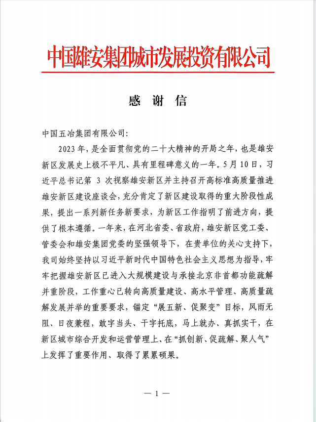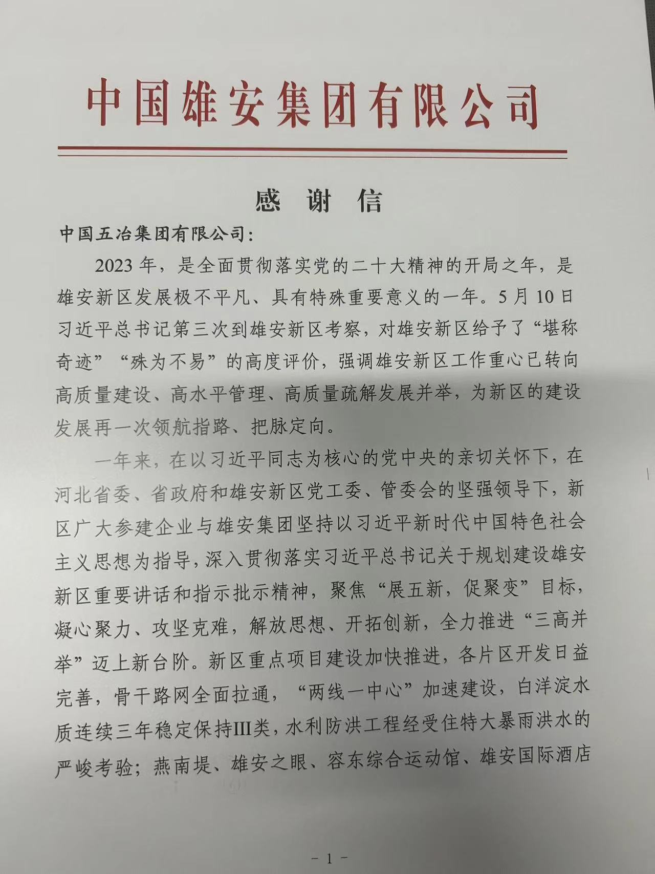 1月16日,中國(guó)雄安集團(tuán)致信中國(guó)五冶集團(tuán),對(duì)中國(guó)五冶項(xiàng)目團(tuán)隊(duì)2023年工作給予高度贊譽(yù),感謝信指出:“2023年,貴單位堅(jiān)持政治站位,始終與雄安集團(tuán)攜手并肩、團(tuán)結(jié)奮斗、嚴(yán)格落實(shí)“兩抓五?!?,克服時(shí)間緊、任務(wù)重、暴雨洪澇、低溫寒凍等諸多不利因素,在精心組織、科學(xué)施工,高標(biāo)準(zhǔn)高質(zhì)量完成了自身承擔(dān)的工作任務(wù)的同時(shí),積極主動(dòng)幫扶定興受災(zāi)地區(qū),為新區(qū)“展五新”做出了積極貢獻(xiàn),為雄安集團(tuán)實(shí)現(xiàn)穩(wěn)健發(fā)展提供了有力支持。在此,特向貴單位以及奮戰(zhàn)在項(xiàng)目建設(shè)一線的全體人員致以最崇高的敬意和最誠(chéng)摯的感謝!”