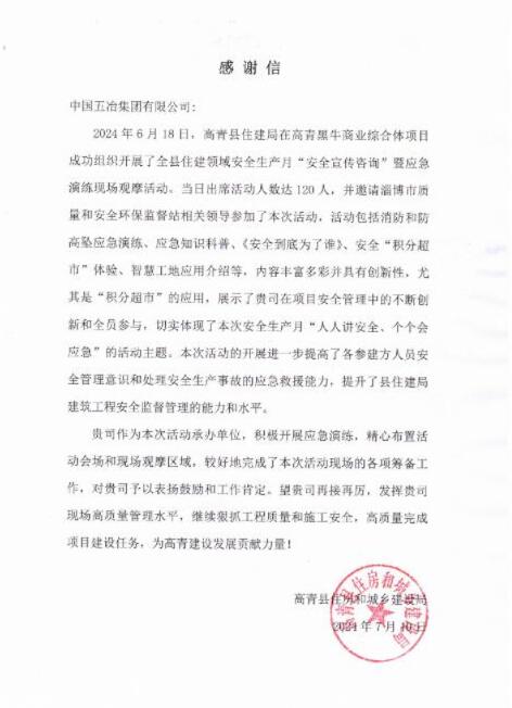信中指出,高青縣住建局在高青黑牛商業(yè)綜合體項(xiàng)目成功舉辦了全縣住建領(lǐng)域安全生產(chǎn)月“安全宣傳咨詢”暨應(yīng)急演練現(xiàn)場觀摩活動(dòng)。中國五冶作為本次活動(dòng)的承辦單位,展現(xiàn)了其在項(xiàng)目安全管理方面的卓越實(shí)力。本次活動(dòng)內(nèi)容豐富多樣,涵蓋了消防和防高墜應(yīng)急演練、應(yīng)急知識(shí)科普、安全“積分超市”體驗(yàn)以及智慧工地應(yīng)用介紹等環(huán)節(jié)。特別值得一提的是,項(xiàng)目團(tuán)隊(duì)在“積分超市”的應(yīng)用上進(jìn)行了創(chuàng)新,充分展示了公司在項(xiàng)目安全管理中的全員參與和不斷創(chuàng)新的精神。這一舉措不僅提高了參與人員的安全管理意識(shí)和應(yīng)急救援能力,為提升縣住建局建筑工程安全監(jiān)督管理能力和水平做出了積極貢獻(xiàn)。