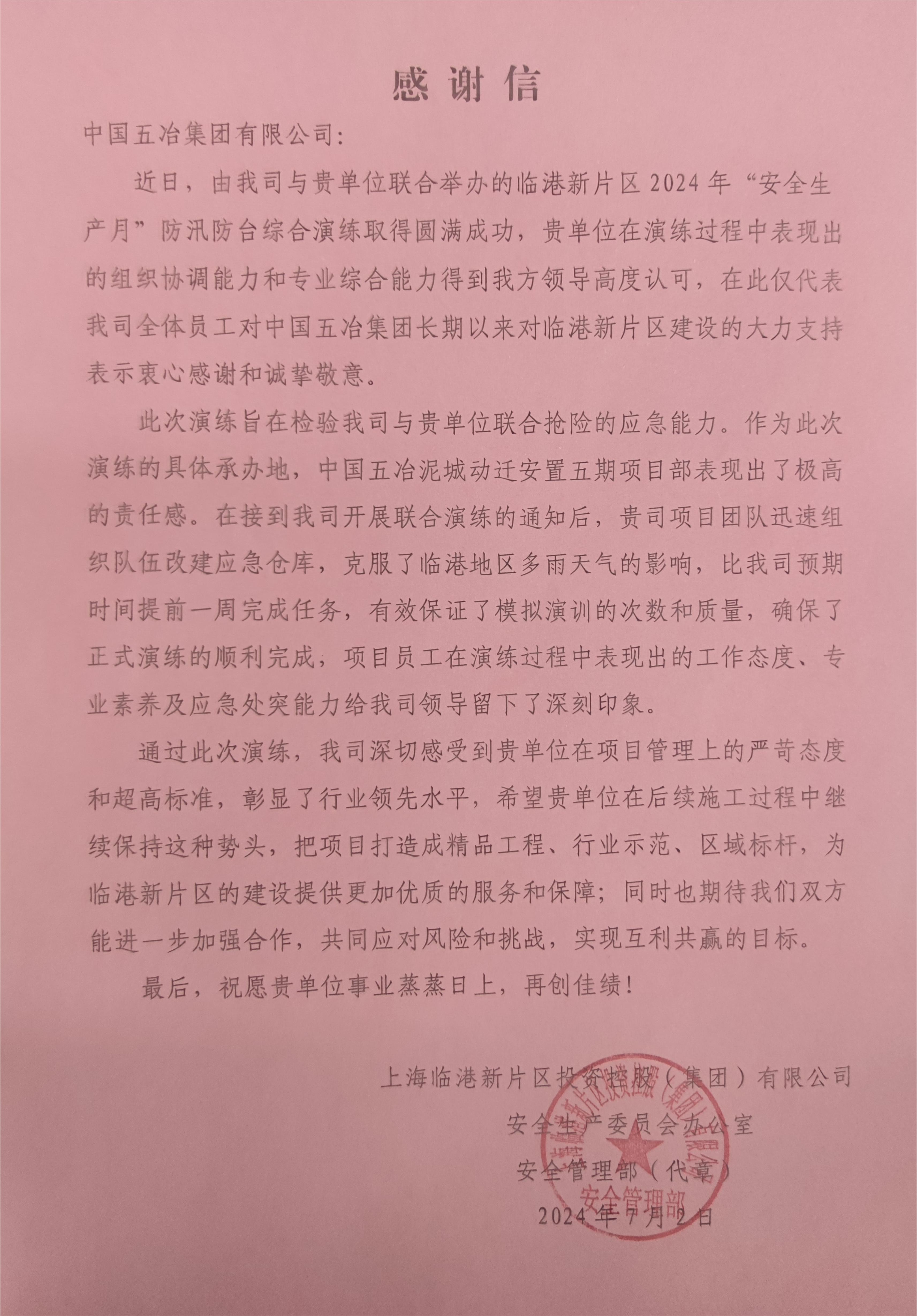 感謝信中指出,在臨港投控集團和中國五冶集團聯合舉行的防汛防臺應急演練中,五冶應急指揮部表現出優秀的組織協調能力和專業綜合能力,項目員工的工作態度、專業素養和應急處突能力給臨港投控集團領導留下了深刻影響,希望五冶團隊繼續從嚴、從細抓好項目管理,把項目打造成精品工程、行業示范、區域標桿。