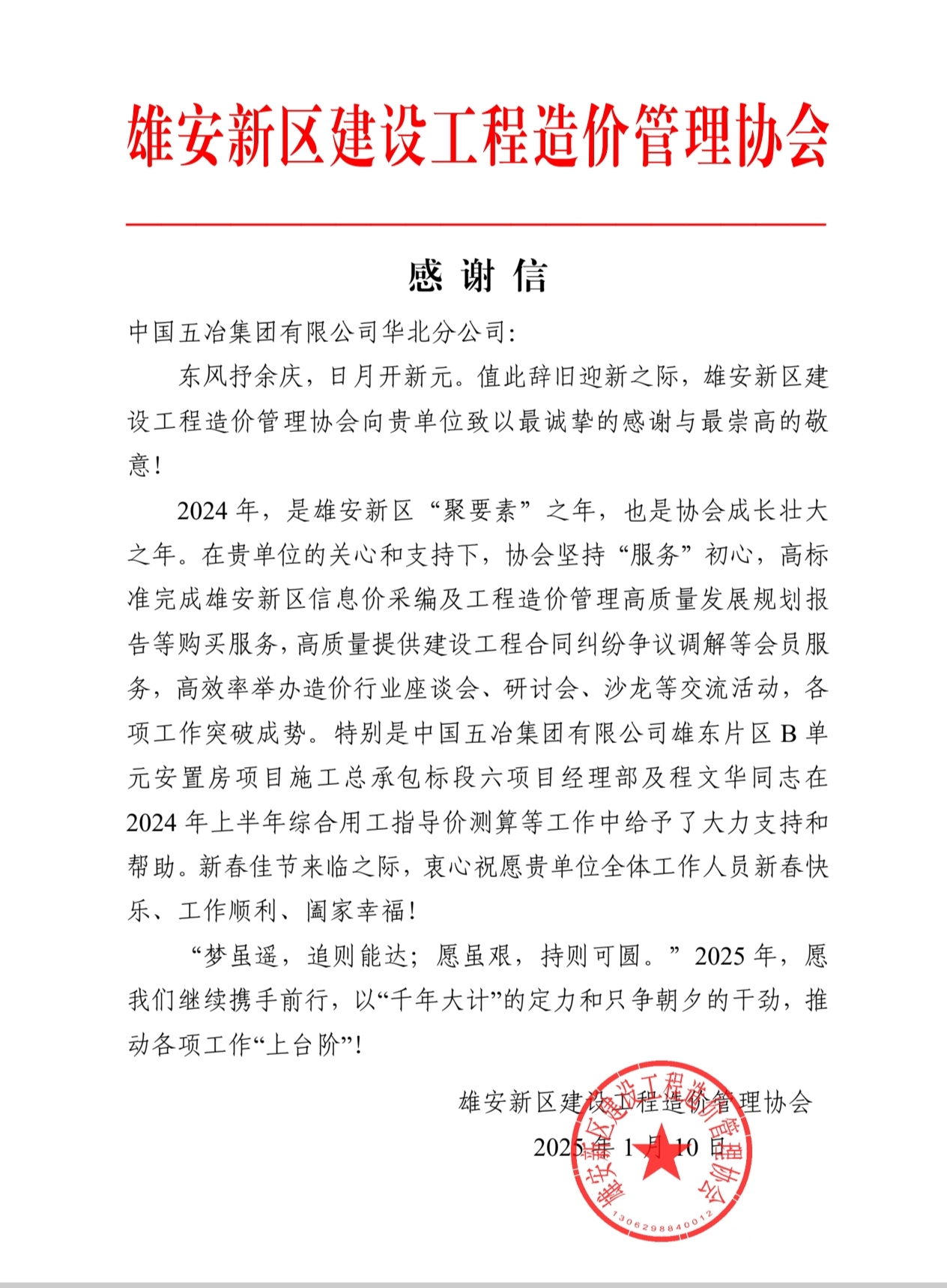感謝信中指出,在中國五冶集團華北公司的關(guān)心與支持下,協(xié)會各項工作突破成勢,特別是在2024年上半年綜合用工指導價測算等工作中雄東片區(qū)B單元安置房六標段項目經(jīng)理部及程文華同志給予了大力支持和幫助。對此,雄安新區(qū)建設(shè)工程造價管理協(xié)會致以最誠摯的感謝與最崇高的敬意!