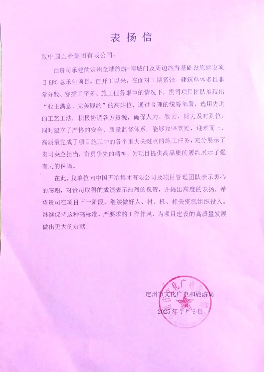 中國五冶集團定州全域旅游-南城門及周邊旅游基礎設施建設項目收到表揚信