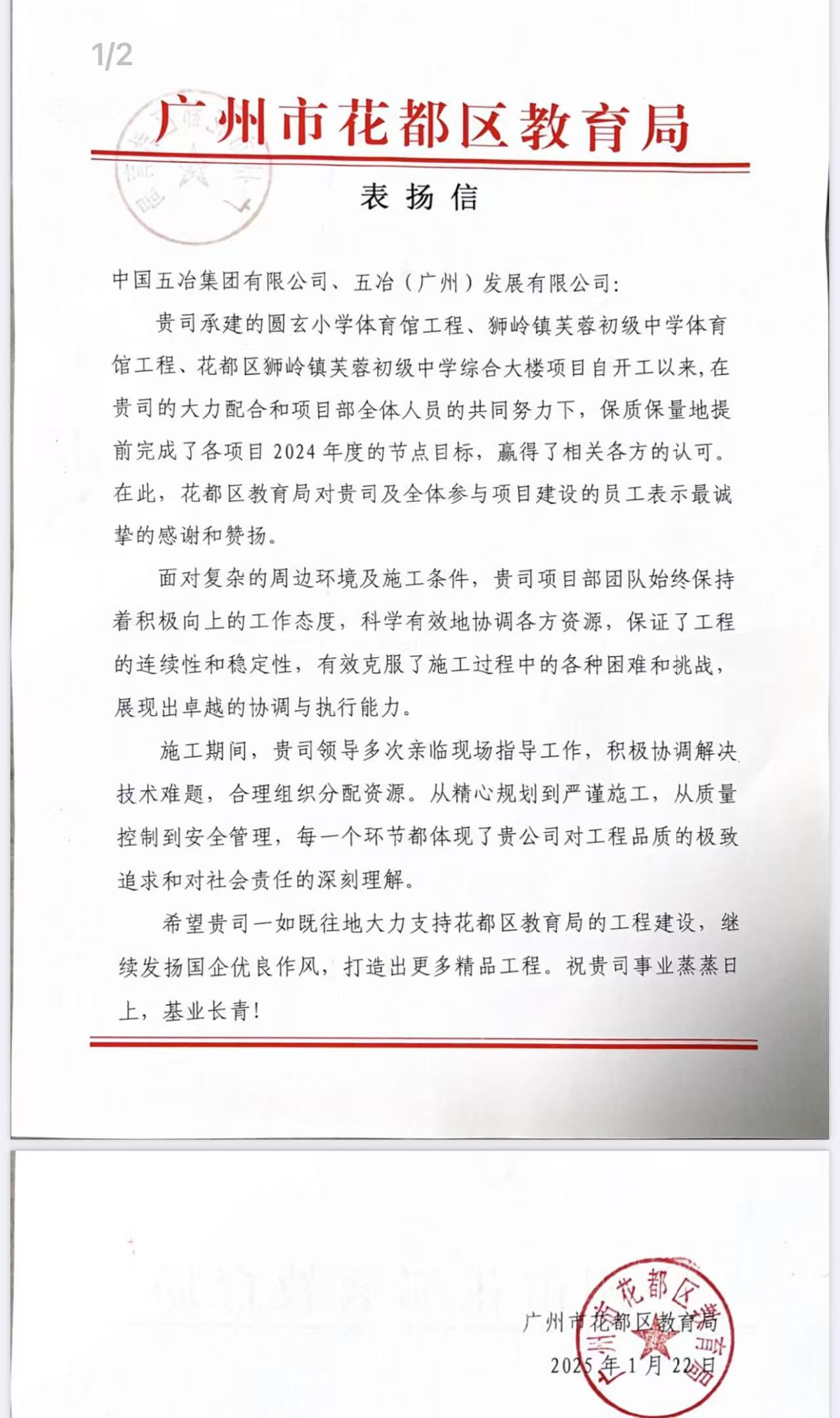 芙蓉中學綜合樓、體育館項目和圓玄小學體育館工程項目收到來自廣州市花都區教育局的表揚信,信中指出:面對復雜的周邊環境及施工條件,項目部團隊始終保持著積極向上的工作態度,科學有效地協調各方資源,有效克服了施工過程中的各種困難和挑戰。施工期間,公司領導多次親臨現場指導工作,積極協調解決技術難題,合理組織分配資源。從精心規劃到嚴謹施工,從質量控制到安全管理,每一個環節都體現了貴公司對工程品質的極致追求和對社會責任的深刻理解。