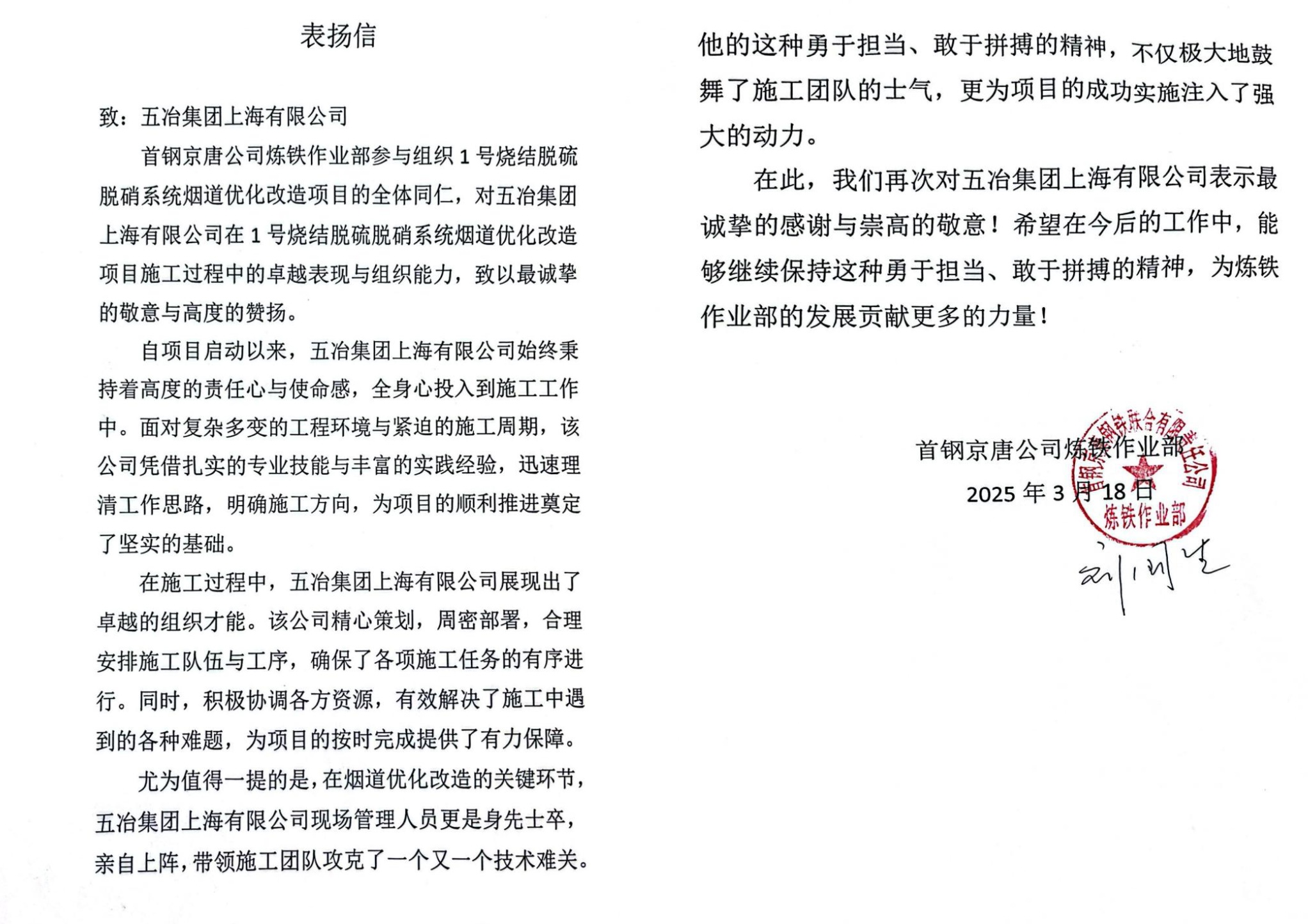 近日,中國五冶集團工程技術服務公司首鋼京唐作業部收到業主單位首鋼京唐公司煉鐵作業部表揚信一封,高度贊揚首鋼京唐作業部在業主單位1號燒結脫硫脫硝系統煙道優化改造項目施工過程中的卓越表現與組織能力。