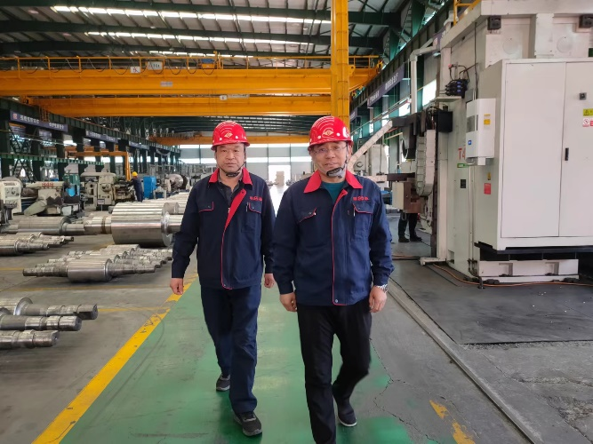 圖為朝陽聯強軋輥有限公司總經理孫建勛(右)視察軋輥生產車間