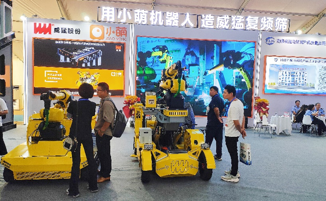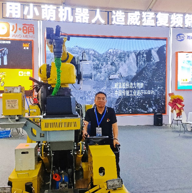 圖為在中原農(nóng)谷首屆振動(dòng)機(jī)械產(chǎn)業(yè)博覽會(huì)上,總經(jīng)理王思民正在展位上操控由威猛股份自主創(chuàng)新研發(fā)的焊接機(jī)器人–小萌。(夏杰生 攝)