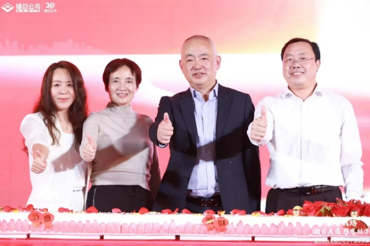 在鐳目三十周年慶典會(huì)場(chǎng),鐳目四位創(chuàng)辦人董事長(zhǎng)田陸(右二)、副總經(jīng)理田立(左二)、技術(shù)總監(jiān)周永輝(右一)、副總經(jīng)理姜芙蓉(左一)在切生日蛋糕,并向出席慶典代表致意!