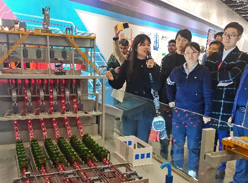 中外來賓在慶典活動(dòng)期間參觀鐳目智能體驗(yàn)中心。鐳目接待部部長(zhǎng)陳甜在重鋼智能連鑄機(jī)模型前講解。
