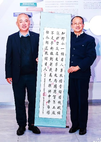 鐳目董事長(zhǎng)田陸博士(左)接受《中國(guó)冶金報(bào)》記者夏杰生代表報(bào)社贈(zèng)送鐳目的慶典賀禮–詩詞書法作品。