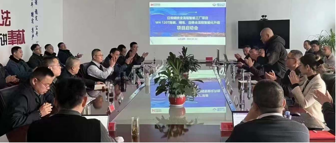 2024年1月3日,日照鋼鐵(以下簡稱日鋼)全流程智能工廠項目W4 120T煉鋼、精煉、連鑄全流程智能化升級項目啟動會在日鋼板材制造部隆重召開。日鋼三位助理副總經理夏侯洪波、陳良、謝基表,以及日鋼信息系統處處長高新永、副處長董淑恩,人力資源處處長李明飛,日鋼W4制造部部長齊林雷,鐳目公司董事長田陸博士、總工王云華,以及鐳目公司日鋼智能化項目經理沈陽等參加了會議。