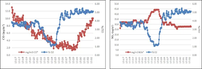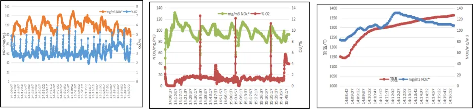 圖8 頂燃式熱風爐煙氣中NOx、CO和O2含量變化及關系
