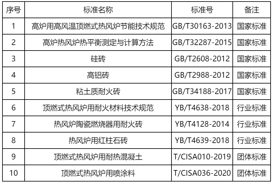 主編或參編了10項熱風爐耐火材料國家標準(5項)、行業標準(3項)和團體標準(2項),創建并形成了完整的熱風爐耐火材料標準規范技術體系,如表2所示。牽頭制定的標準涵蓋熱風爐節能、熱平衡測定及計算方法等國家標準,還包括頂燃式熱風爐用耐火材料技術規范、熱風爐用紅柱石磚、熱風爐陶瓷燃燒器用耐火磚等行業標準,覆蓋了熱風爐燃燒、傳熱、節能、減排、耐火材料配置、材料制造、技術評價等多維度技術標準,由技術到產品,從關鍵技術的研發與領先,發展成為技術標準體系的創建與完善。