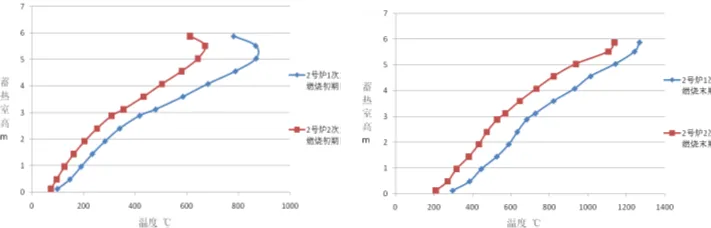 圖20 試驗熱風爐燃燒期蓄熱室溫度分布