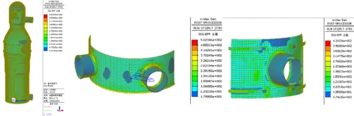 基于彈塑性力學理論,對熱風爐爐殼及管道強度進行了有限元仿真計算,為爐殼精準設計提供了科學依據(圖25),京唐3號高爐熱風爐首創采用耐腐蝕不銹鋼+高性能合金鋼復合爐殼結構(904L+Q345LK)。