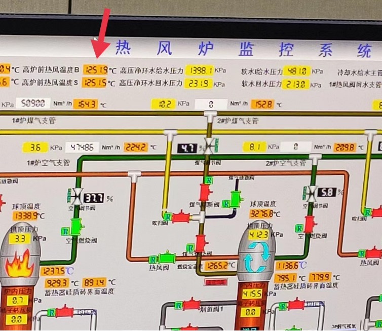 從仙福鋼鐵新建2#高爐主控室熱風爐監(jiān)控系統(tǒng)可知,此時的熱風爐正在1251.9℃高風溫狀態(tài)下安全運行(夏杰生 攝影)