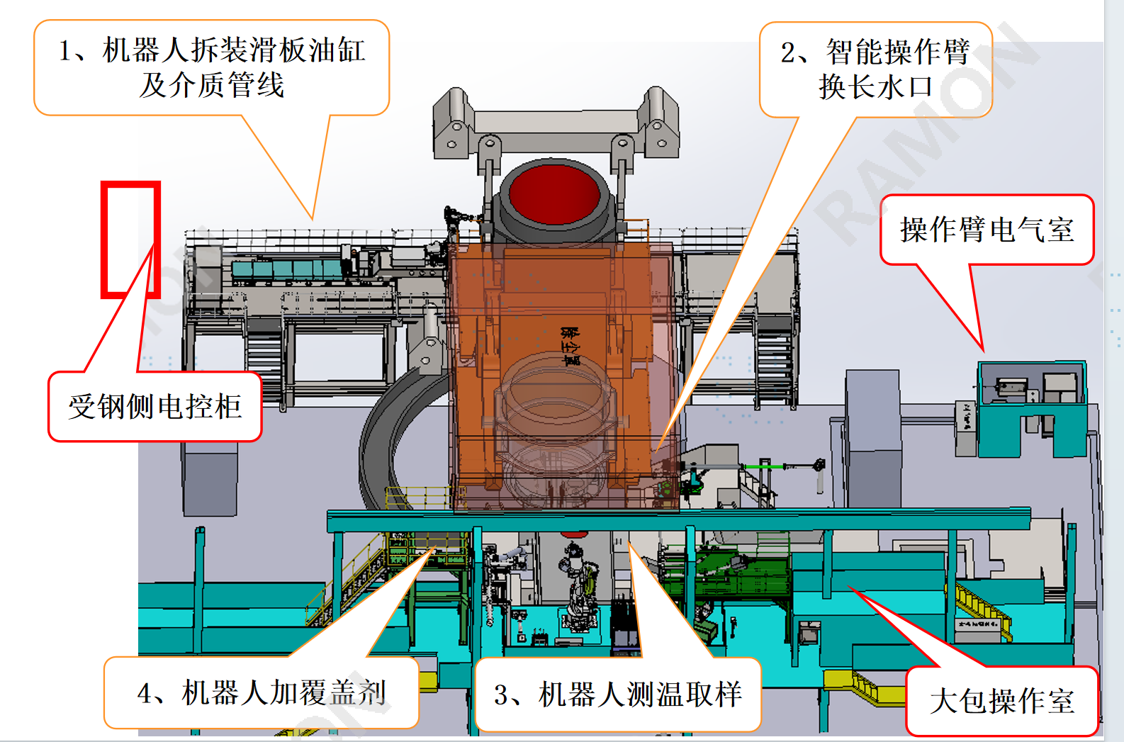 鐳目為周鋼定制的2臺智能澆鋼平臺以工業機器人為核心,整合拆裝滑板油缸、智能換長水口、測溫取樣、加覆蓋劑四大關鍵功能系統,構建起從鋼水轉運到澆鑄保障的全流程智能化體系,讓高端鑄機的生產潛力得到充分釋放,推動周鋼寬厚板生產向更高效、更智能、更穩定的方向邁進。