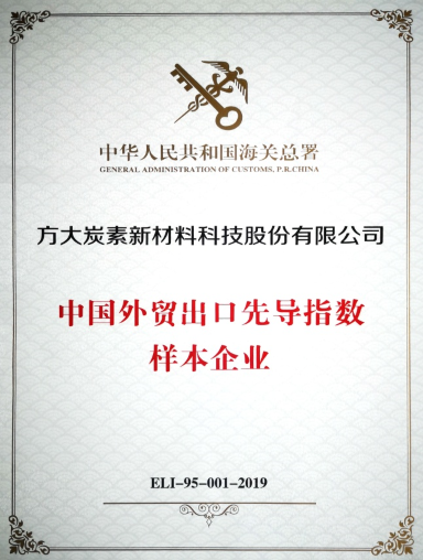 近日,蘭州海關向方大炭素頒發了“中國外貿出口先導指數樣本企業”證書,此證書由中華人民共和國海關總署簽署。