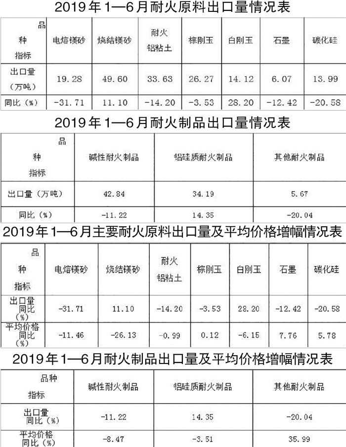出口量和出口平均價(jià)格全面下降。1月~6月份,耐火原材料出口量和出口綜合平均價(jià)格同比分別下降4.84%和7.56%。其中耐火原料同比分別下降5.55%和9.17%,耐火制品同比分別下降2.99%和6.65%。