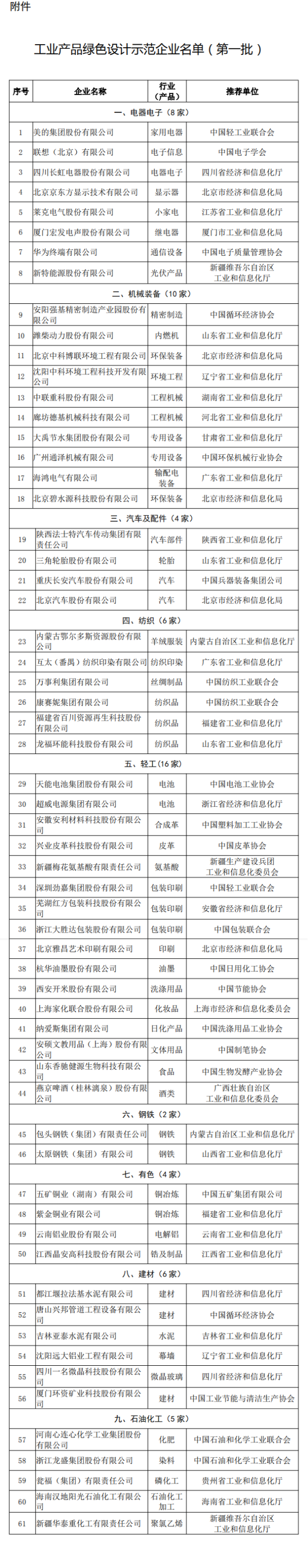 一、確定美的集團股份有限公司等61家企業(yè)為工業(yè)產(chǎn)品綠色設(shè)計示范企業(yè)(具體名單見附件)。因試點期已結(jié)束,未通過驗收的其他38家試點企業(yè),不再列為工業(yè)產(chǎn)品綠色設(shè)計試點企業(yè)名單。