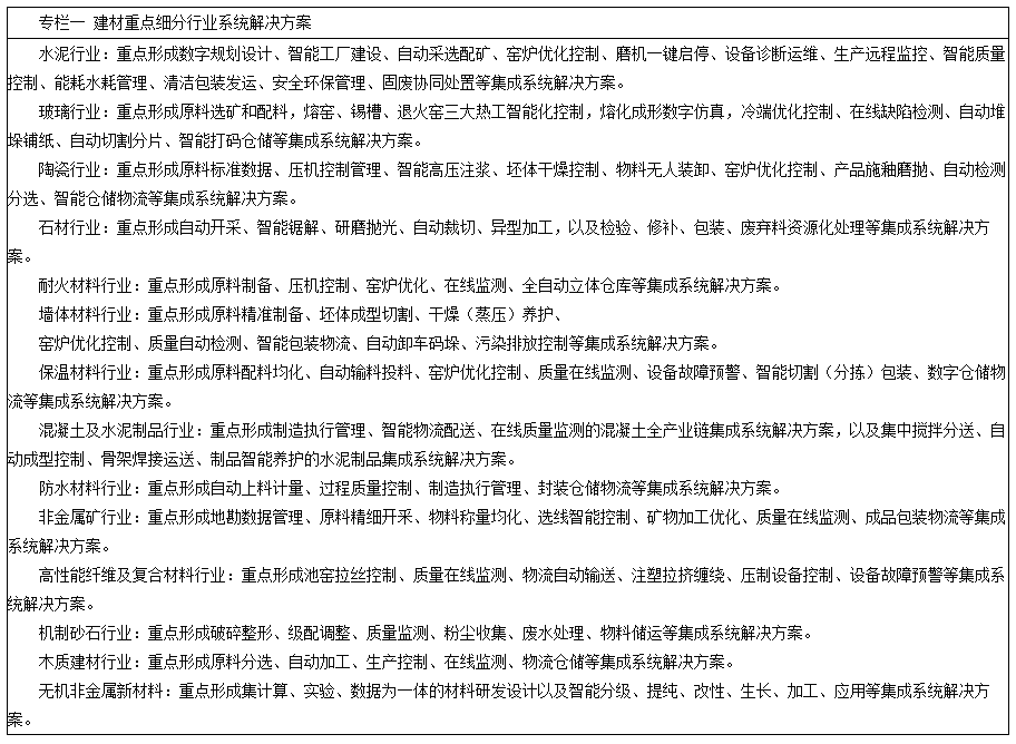 6.形成一批系統解決方案。針對建材細分行業特點,以礦山開采、原料制備、破碎粉磨、窯爐控制、物流倉儲、在線檢測等關鍵環節為重點,提煉形成若干套具有智能感知、自動執行、深度學習、智能決策、密碼防護等功能的智能化、數字化、集成化系統解決方案,促進水泥、玻璃、陶瓷等行業生產方式的自動化、智能化、無人化變革。