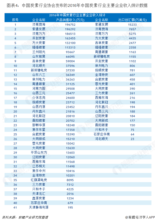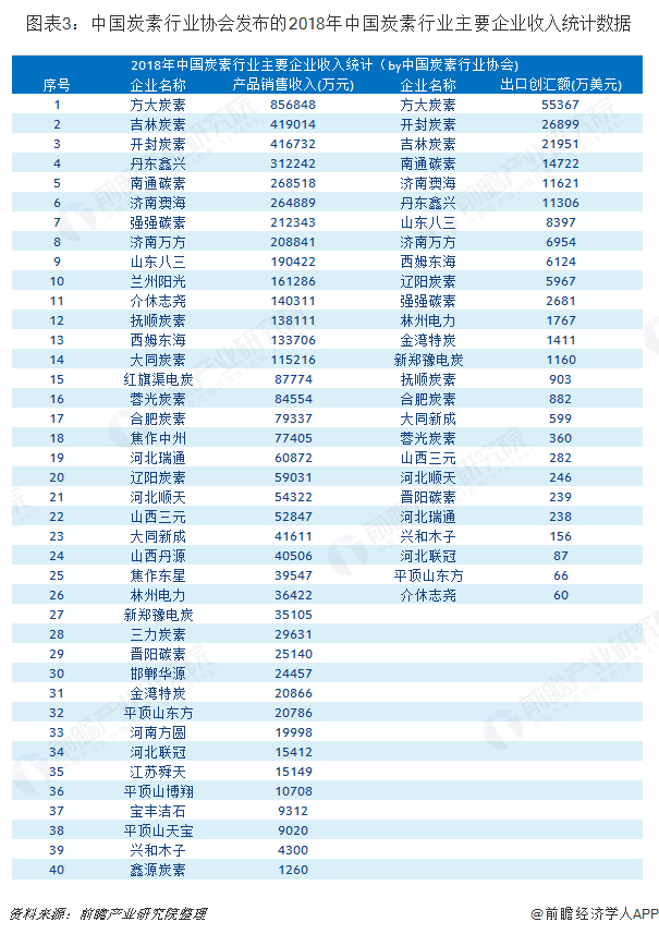 根據中國炭素協會發布的數據,2018年方大炭素的產品銷售收入和出口創匯額均排在首位。吉林炭素、開封炭素緊隨其后。