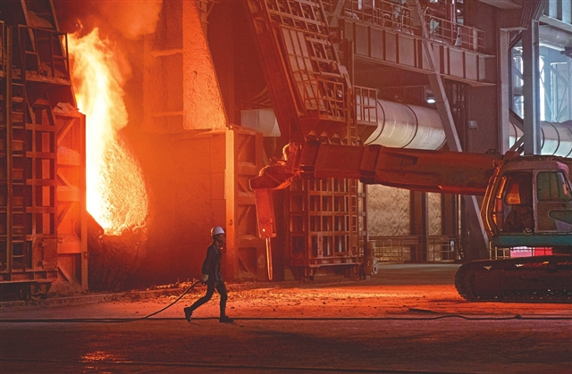 重慶鋼鐵煉鋼廠,一名工人從煉鋼爐旁走過。