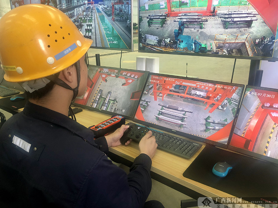 廣西新聞網(wǎng)防城港8月3日訊(記者 李勤虹)手里拿著一個“XBOX游戲手柄”,廣西鋼鐵集團有限公司冷軋廠的90后技術(shù)員彭期文安坐在舒適的冷軋廠·移動·華為技能專家5G創(chuàng)新工作室內(nèi),這里安裝了空調(diào),室內(nèi)溫度26度左右,和車間里近40度的高溫形成了鮮明的對比。只見彭期文手指靈活地按動手柄,操控大屏幕上顯示5G智能裝載機輕松地將軋輥吊起,運送到磨床……拿起手柄,就可以成為一名操控裝載機的“游戲大咖”,這些“黑科技”場景,已在廣西鋼鐵集團有限公司冷軋廠變?yōu)楝F(xiàn)實。通過5G技術(shù),讓廣西鋼鐵集團有限公司冷軋廠的技術(shù)員們開動起自動裝載機來,猶如置身大型3D游戲一般的體驗。