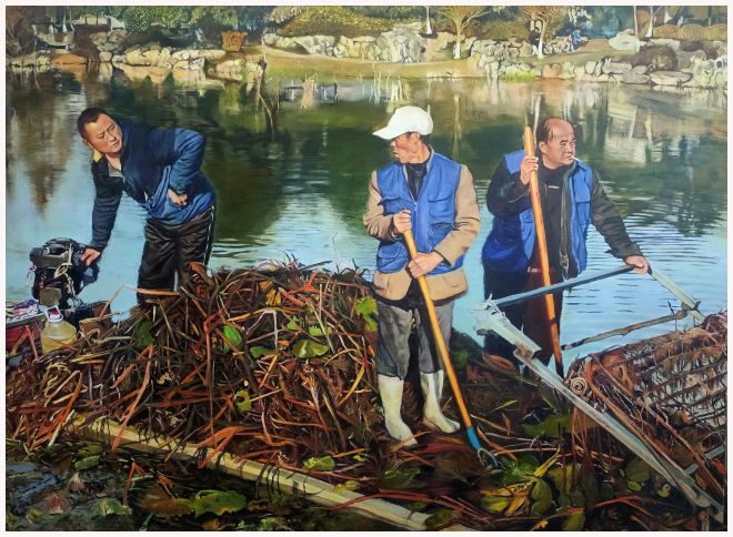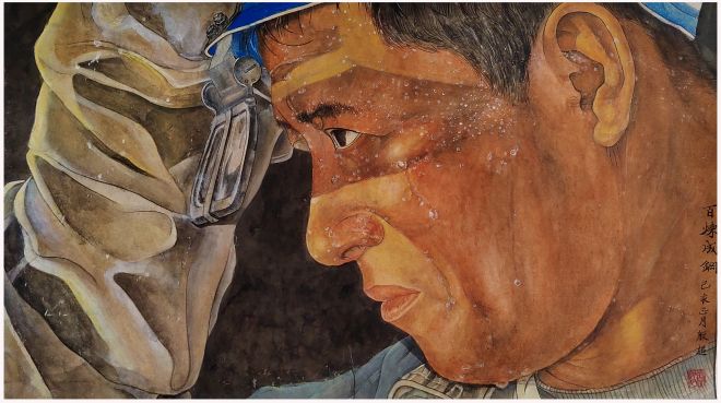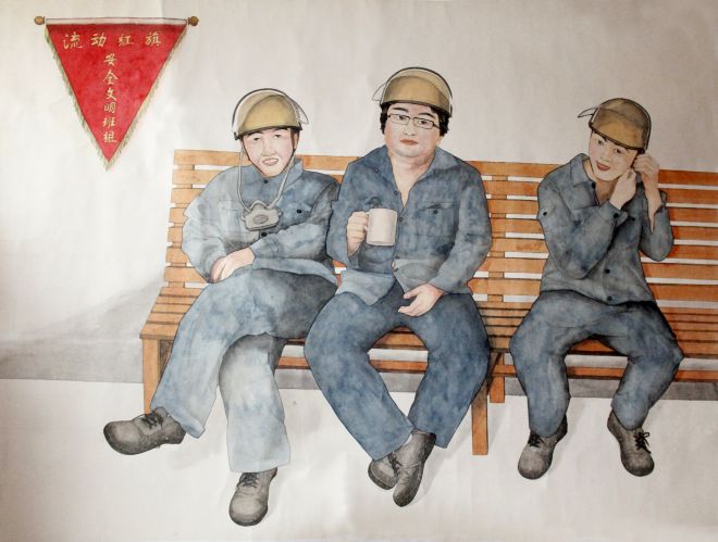 《煉鋼工人休息室》國畫 張婧(萊鋼)