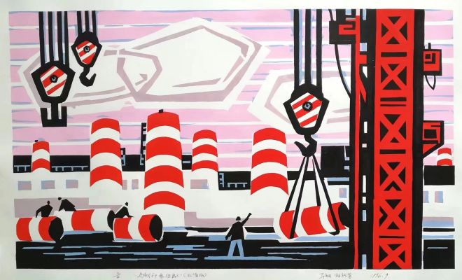 《吊裝新管道》版畫 劉新芳(馬鋼)