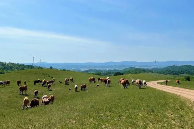 山下,成群的黃底白花大牛沿著如波浪起伏般的草原林場緩緩從落葉松林、白樺林旁走過。“這里的白樺與東北的不同,不是一棵一棵的,而是一根多干。一個根系可以生長七八棵甚至十幾棵樹干,特別像一代代塞罕壩人,接續奮斗。經過育苗、造林、護草……現在牧場‘林、牧、游、電’四大產業并舉,產業協調發展的經驗上過好幾次央視、新華網呢!”老張說。