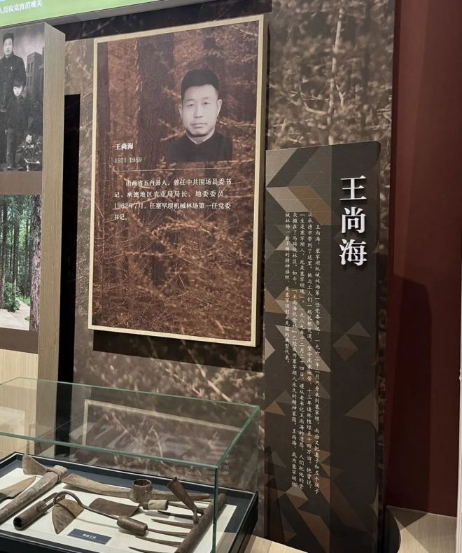 第一展廳主要介紹艱苦創業歷程。在林場首任黨委書記王尚海指揮馬蹄坑“大會戰”一組圖片前,講解員介紹說:“1962年,王尚海只身來到塞罕壩,而后又把妻子和5個孩子從承德市帶到了這里。他帶領職工克服困難,13年造林植綠54萬畝。從這里開始進行了大規模機械化造林,種活了塞罕壩百萬畝林海第一片林,造就了塞罕壩精神。1989年12月24日,遵從老書記王尚海的遺愿,人們把他的骨灰撒在了馬蹄坑林區。如今,王尚海紀念林已經成為塞罕壩人永久的精神家園。”